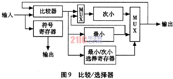 ??? 比較/選擇器的作用是計算,即2.1.3式的后半部分。由于輸出的絕對值只有兩種:最大值和次最大值,因此只需得到最大值和次最大值以及各自對應(yīng)的位置,并記錄對應(yīng)的正負(fù)符號,就可以完全確定。