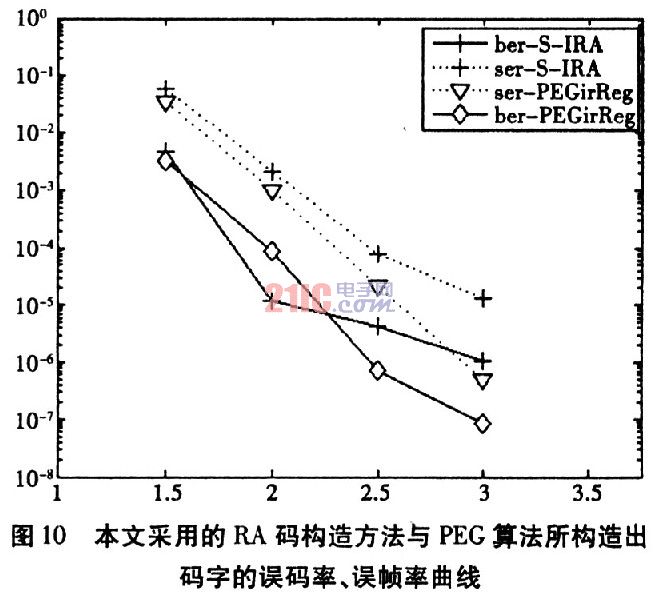 ??? 圖lO中黑色曲線為本文提出的RA碼構(gòu)造方法所構(gòu)造出碼字的誤碼率曲線和誤幀率曲線。仿真選擇碼長為1008,碼率1/2,b=7,列重分布盡量符合密度進化算法的結(jié)果。采用BPSK調(diào)制,AWGN信道,采用log-BP算法譯碼,最大迭代次數(shù)為50次。