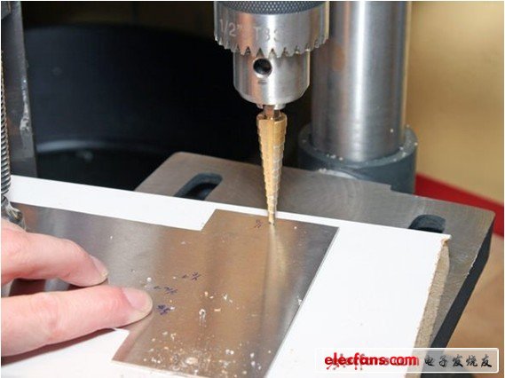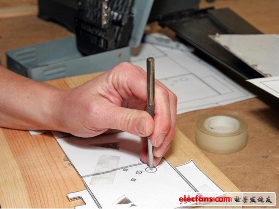 ● 按照?qǐng)D上標(biāo)十字線處的尺寸鉆孔,要首先取下貼上去的圖紙(不過別扔了),用鉆頭對(duì)準(zhǔn)前面留下的沖痕開鉆可以使鉆孔更精確
