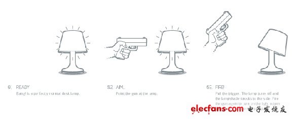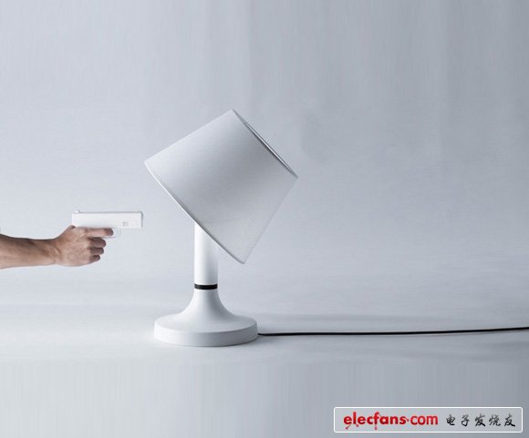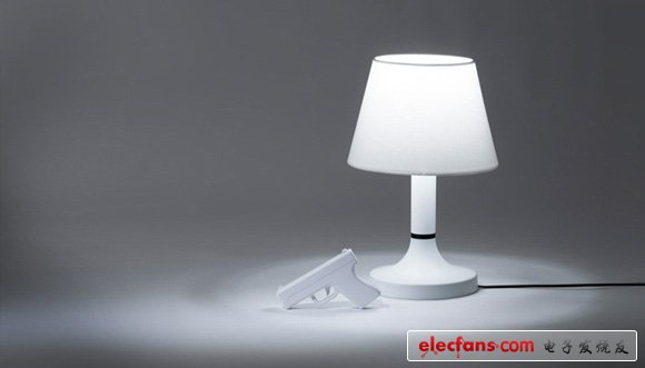 這座看起來沒什么兩樣的床頭燈,不仔細(xì)瞧還真看不出有什么異狀,但是旁邊那只手槍也太搶眼了吧! 沒錯! 設(shè)計(jì)師將遙控器做成手槍形狀,早上起床了只要瞄準(zhǔn)桌燈,就可以扣下鈑機(jī)讓桌燈立地成佛,呃…是關(guān)燈啦,多多少少可以消除你早上的起床怨念??!
