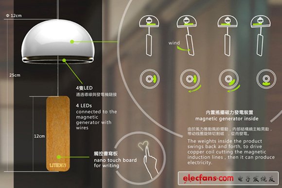 這是一款風(fēng)能驅(qū)動的LED掛燈,它的造型來源于傳統(tǒng)的日本風(fēng)鈴,當(dāng)微風(fēng)吹過它的時候就會通過搖擺晃動帶動微型發(fā)電機(jī)工作,在黑暗中發(fā)出一種幽暗寧靜的燈光,在燈的底部還懸掛有一塊小型木板,除了裝飾外還可以在上面寫下美好的祝愿。