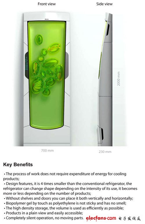 生物機(jī)器人冰箱用冷光來(lái)冷卻生物高分子凝膠。它看起來(lái)有點(diǎn)粘糊糊的,實(shí)際上卻是一種無(wú)味的凝膠,可以把食物包裹起來(lái)。