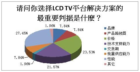 這一結(jié)果顯示,中國客戶在選擇LCD TV平臺(tái)時(shí)已不再迷信品牌,品牌影響力已變得不再像以前那么重要,采購經(jīng)理和項(xiàng)目經(jīng)理最看重的因素是平臺(tái)的性能,這預(yù)示著目前LCD TV制造商的市場策略主要還是以提高產(chǎn)品性能的差異化來獲得更大的利潤,供應(yīng)價(jià)格不是最關(guān)鍵的采購決策依據(jù),因?yàn)樗谀壳爸袊圃焐痰牟呗灾羞€不是創(chuàng)造利潤的關(guān)鍵因素,它還僅是一個(gè)次要因素,技術(shù)支持能力之所以重要,是因?yàn)樗荓CD TV制造商趕上目前性能決定利潤市場窗口期的必要保證。