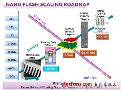 Altimime揭示了快閃記憶體發(fā)展藍(lán)圖,并展示在17nm節(jié)點采用垂直8層堆疊,從傳統(tǒng)浮閘快閃記憶體轉(zhuǎn)換到所謂的 SONOS 快閃記憶體。他聲稱在14nm~11nm節(jié)點堆疊數(shù)量還可增加到16層。而 RRAM 要進(jìn)入實際應(yīng)用,也必須擁有類似的堆疊架構(gòu)才能在市場上競爭。 SONOS 全名為Silicon Oxide Nitride Oxide Silicon (矽-氧-氮化矽-氧-矽)。