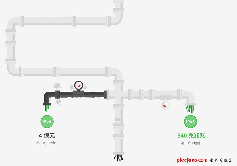 顯然,互聯(lián)網(wǎng)需要更多 IP 地址。那么究竟還需要多少呢?340 兆兆兆 個(gè)應(yīng)該夠了吧? 沒錯(cuò),這就是新一代的互聯(lián)網(wǎng)“管線體系”IPv6 所能提供的地址數(shù)量。如此龐大的數(shù)量足以讓地球上的每一個(gè)人都擁有數(shù)十億個(gè) IP 地址,換句話說,這一數(shù)量足夠在目前和可預(yù)見的未來 為互聯(lián)網(wǎng)的發(fā)展提供無限的地址空間。
