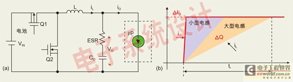 圖1:(a) 同步降壓轉(zhuǎn)換器拓撲結(jié)構(gòu)圖;(b) 負載瞬態(tài)過程中的負載電流和電感電流。