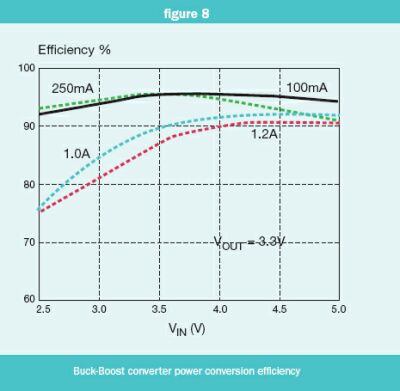 為利用最小尺寸解決方案進一步滿足延長電池使用壽命的要求,這里采用集成的N通道MOSFET作為頂部的開關(guān)MOSFET。對于給定的裸片尺寸,N通道MOSFET的導(dǎo)通電阻比P通道MOSFET低,因此這種方案進一步減少了傳導(dǎo)損耗。然而,驅(qū)動N通道MOSFET需要借助電荷泵電路提供高柵極驅(qū)動電壓。由德州儀器(TI)開發(fā)的一項創(chuàng)新技術(shù)在保持總芯片尺寸小于P通道MOSFET的同時,將這些電荷泵電路集成到芯片上,從而以最小尺寸的解決方案實現(xiàn)最高效率。圖5給出了TPS6300在各種負載條件下典型的應(yīng)用電路圖,其最高效率可達95%。圖6為該電路在各種負載條件下的效率曲線圖。