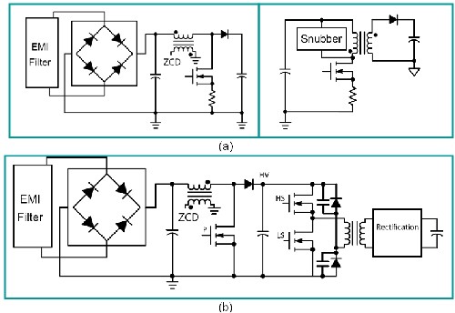 如前所述,一旦功率大于75W,除了滿足上述工作能效及空載能耗要求外,電路中還面臨著加入PFC的要求,這在改善功率因數(shù)、使電網(wǎng)電能得到更高效利用的同時,也會使得電路結構更為復雜。在這類應用中,傳統(tǒng)電源架構是PFC+PWM的兩段式架構,即在非連續(xù)導電模式(DCM)或臨界導電模式(CrM)段后跟隨著準諧振反激段,每個段都使用一個控制器,如圖2(a)所示。