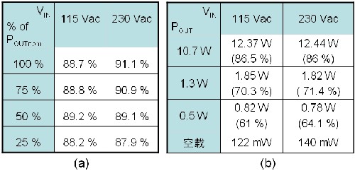 表2:NCP1380谷底開關控制器的工作能效及待機能耗(a、工作能效;b、輕載及空載能耗)。