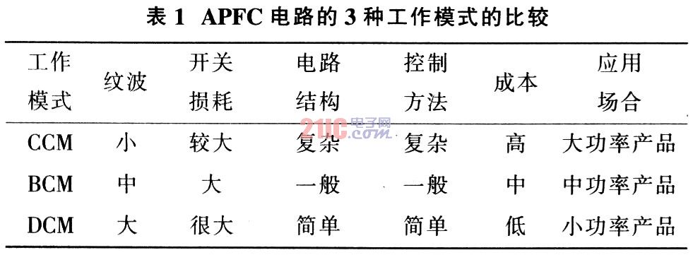 ??? 有源功率因數(shù)校正(APFC)電路,根據(jù)電感電流是否連續(xù),其工作模式可分為連續(xù)導電模式(Continuous ConductionMode,CCM)、斷續(xù)導電模式(Discontinuous Conduction Mode,DCM)和臨界導電模式(Boundary Conduction Mode,BCM)3種。這3種工作模式的特點比較如表1所示。本文APFC電路設(shè)計采用BCM的工作方式。