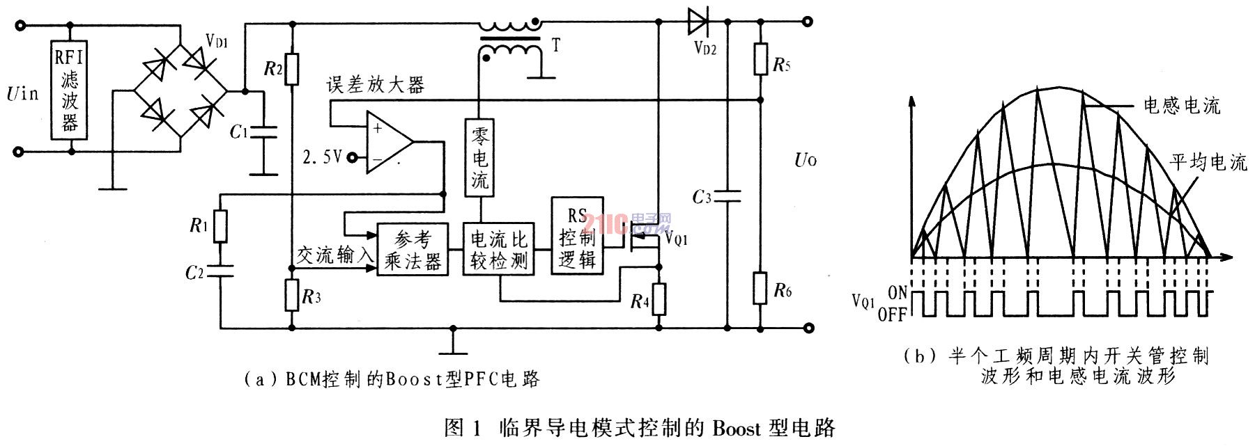 ??? 圖1是臨界導電控制模式實現(xiàn)Boost型PFC電路的原理圖及其半個工頻周期內(nèi)功率開關(guān)管的控制波形和電感電流波形。圖1(a)是一種實現(xiàn)變頻控制方案的電路原理圖,其中誤差放大器將輸出電壓的反饋信號和2.5 V基準信號相比較后放大,產(chǎn)生的輸出信號和交流輸入電壓檢測信號共同輸入模擬乘法器.使模擬乘法器產(chǎn)生一個和輸入電壓同頻同相的半正弦波輸出信號。當功率管開啟時,電阻R4對電感電流進行檢測,當電感電流達到模擬乘法器的輸出時,電流比較檢測器輸出一控制脈沖,觸發(fā)RS控制邏輯部分使功率管關(guān)斷,電感開始放電,這樣就保證電感電流的峰值包絡(luò)線是與輸入電壓同頻同相的半正弦波。當電感放電時,用電感的副邊輸出對電感電流過零檢測,為電感放電完畢時,RS控制邏輯部分立刻使功率管重新導通。整體電路采用電壓-電流的雙環(huán)反饋控制、利用變頻控制法實現(xiàn)Boost型PFC電路,功率因數(shù)接近1。