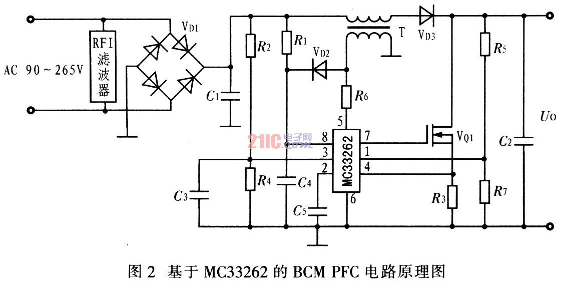 關(guān)鍵詞:有源功率因數(shù)校正(APFC);Boost變換器;臨界導電模式(BCM);MC33262
