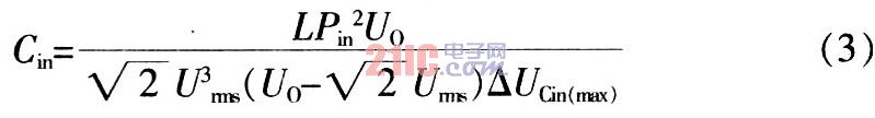 ??? 在PFC電路中。通常在整流橋的輸出端接一只小電容,用于濾除由高頻開關(guān)電感電流的紋波引起的噪聲。如果該電容取值太小,可能無法較好濾去輸入的高頻噪音,但其取值也不能太大,否則會引起較大的輸入電壓偏移。濾波電容的最大紋波電壓用△UCin(max)表示,一般情況下,可取該值小于最低輸入電壓峰值的5%,則輸入濾波電容的下限值為: