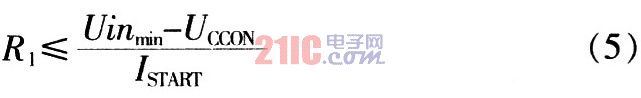??? 啟動電路由R1和C4組成。根據(jù)啟動電流ISTART和啟動門限電壓Uccon來確定啟動電阻的值,即: