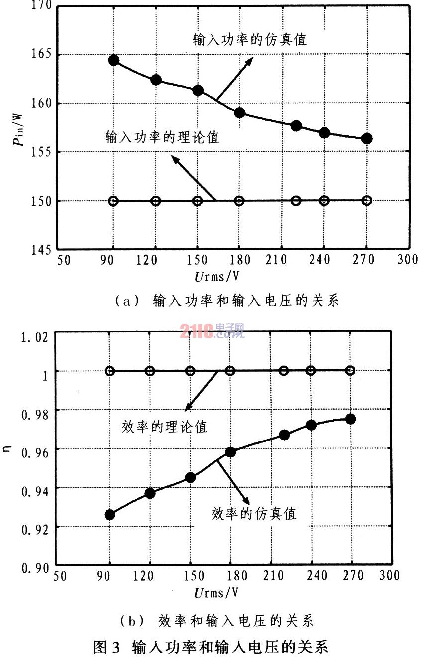 ??? 為了詳細分析BCM PFC電路.將輸入電壓擴展到全電壓范圍內(nèi),并對仿真數(shù)據(jù)和理論數(shù)據(jù)進行詳細的分析比較。當輸入電壓有效值為90 V、120 V、150 V、180 V、220 V、240 V、270 V時,假設(shè)電路無任何損耗,輸入功率為150 w。由仿真結(jié)果可知,輸入功率的仿真值分別為164.4W、162.4W、161.3W、159.0W、157.6w、156.9w、156.3W,效率的仿真值分別為92.6%、93.7%、94.5%、95.8%、96.7%、97.2%、97.5%。將理論值和仿真值相比較.采用MATLAB將這些理論值和仿真值分別擬合成兩條曲線.如圖3所示。