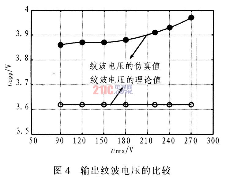 ??? 輸出電壓的紋波的仿真值和理論值的比較如圖4所示。從圖4看出仿真的最大值小于4 V,小于給定的設(shè)計要求,而理論值也小于4 V,完全滿足設(shè)計要求。