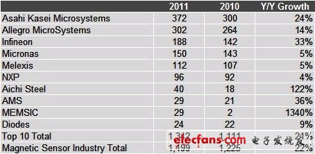 在前十大磁感測器供應(yīng)商中,Memsic的年度營收成長率表現(xiàn)最佳,成長幅度高達(dá)1,340%;該公司的成長動力來自于大客戶Samsung的電子羅盤訂單,而且其2010年的電子羅盤出貨量非常少。Aichi Steel則是成長率第二高的供應(yīng)商,幅度122%,營收主要貢獻(xiàn)來自于Sharp的手機產(chǎn)品。