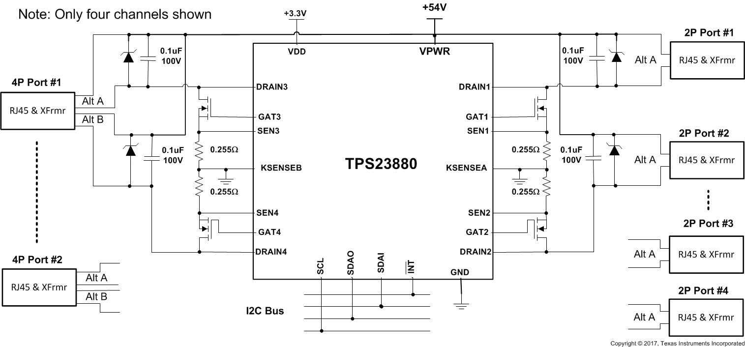 端口重映射和與TPS2388的引腳對(duì)腳兼容性可輕松實(shí)現(xiàn)上一代PSE設(shè)計(jì)的遷移,并支持可互換2層PCB設(shè)計(jì)以適應(yīng)不同系統(tǒng)的PoE電源配置。