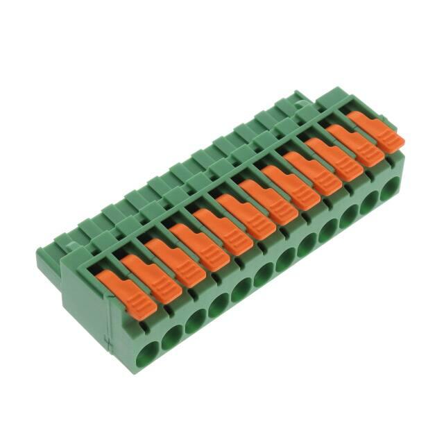 Plug and pull terminal board end/socket opening 10Pin spacing: 5.08mm 1 row straight pin green