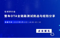 9月18日在線研討會 | 整車OTA全鏈路測試挑戰(zhàn)與經(jīng)驗(yàn)分享2025-09-12 16:28