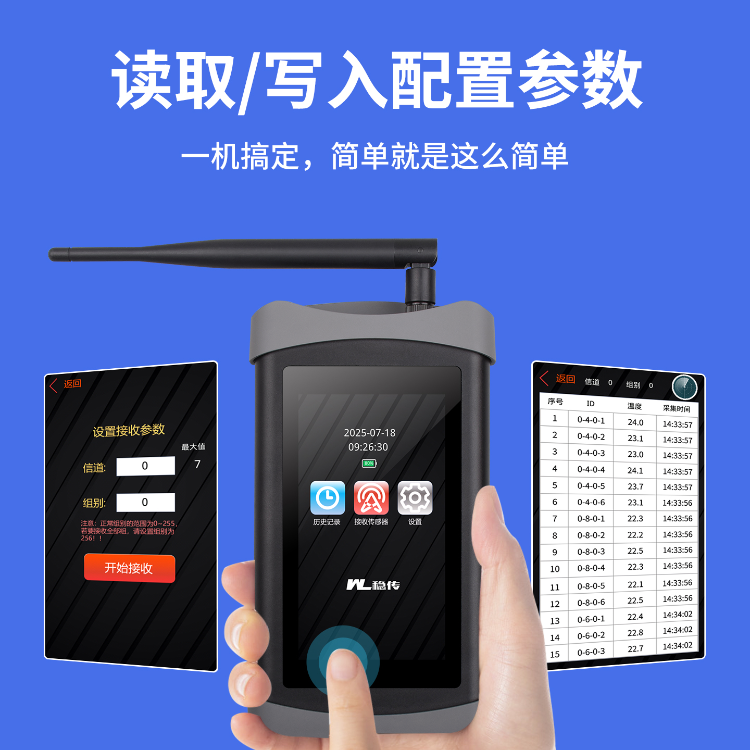 實時數(shù)據(jù)接收: 可同時接收并顯示大量傳感器(如溫度)的數(shù)據(jù)。參數(shù)讀寫配置: 可直接在現(xiàn)場對傳感器進(jìn)行信道、組別、ID等參數(shù)的配置與修改,簡化運維流程。歷史記錄存儲與導(dǎo)出: 自動存儲所有巡檢數(shù)據(jù),并通過USB Type-C接口方便地導(dǎo)出報告。