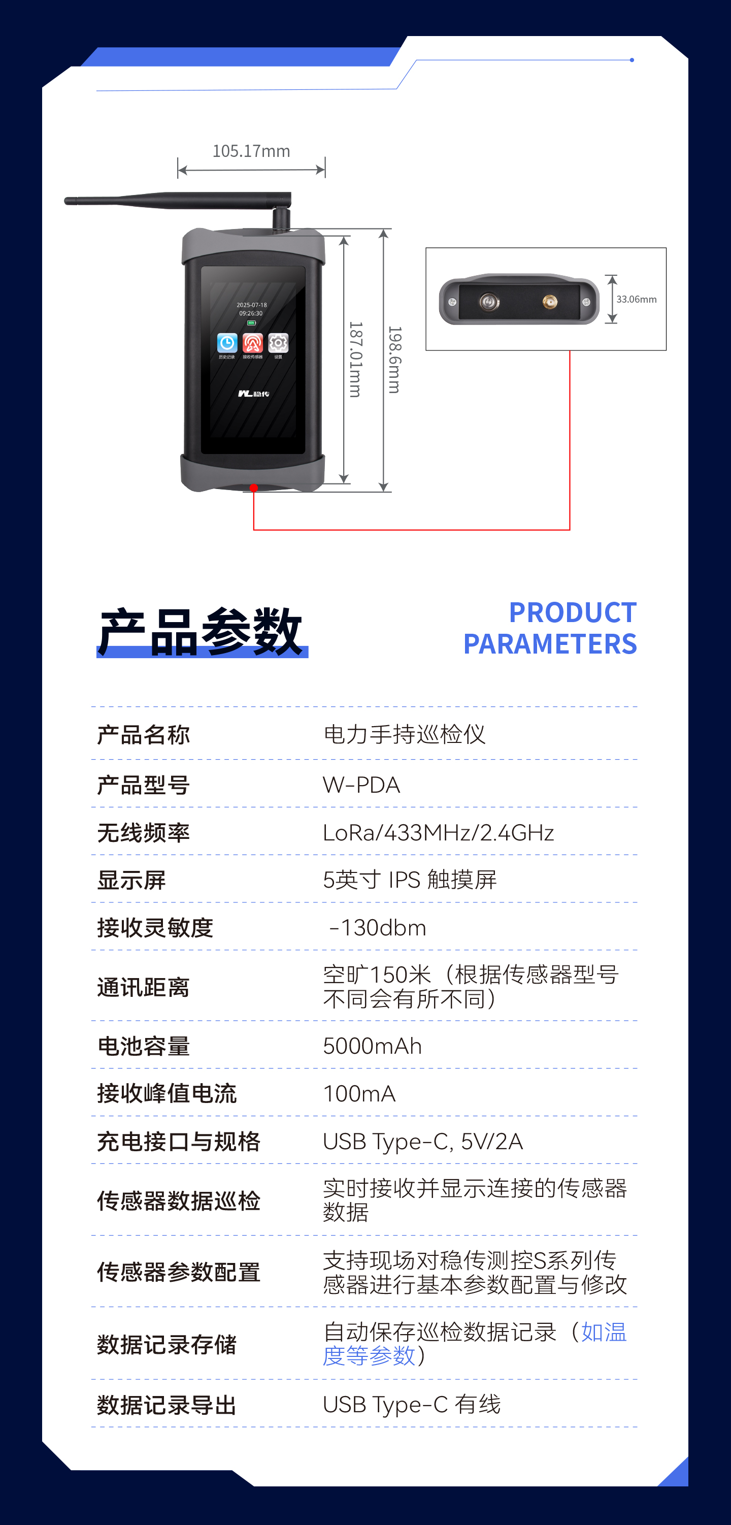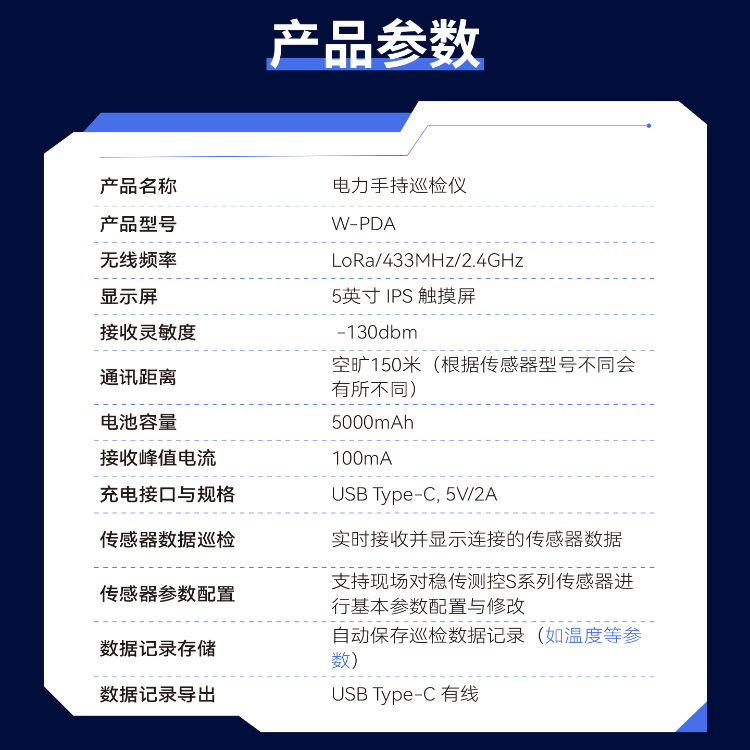 二、應(yīng)用領(lǐng)域 W-PDA 多功能手持電力巡檢儀適用于所有需要遠(yuǎn)程、批量采集無線傳感器數(shù)據(jù)的工業(yè)巡檢場景,主要包括: 電力系統(tǒng): 配電房、電纜溝、發(fā)電站(溫度、局放等監(jiān)測)。交通設(shè)施: 鐵路隧道、地鐵站(環(huán)境溫濕度、設(shè)備狀態(tài)監(jiān)測)。工礦企業(yè): 生產(chǎn)車間、倉庫、礦洞(設(shè)備運行狀態(tài)、環(huán)境參數(shù)監(jiān)控)。數(shù)據(jù)中心/監(jiān)控室: 機(jī)柜溫度巡檢、動環(huán)監(jiān)控。其他: 任何需要使用LoRa/433M/2.4G無線測溫傳感器進(jìn)行數(shù)據(jù)采集和設(shè)備配置的領(lǐng)域。總結(jié) W-PDA 多功能手持電力巡檢儀是一款設(shè)計專業(yè)、功能全面、堅固耐用的工業(yè)級工具。它完美地解決了在復(fù)雜工業(yè)環(huán)境中傳感器數(shù)據(jù)采集難、設(shè)備配置繁瑣、續(xù)航焦慮等痛點。其多頻段兼容性和強(qiáng)大的就地配置能力是其核心優(yōu)勢,將傳統(tǒng)繁瑣的運維工作變得簡單高效。對于從事電力、交通、工礦等行業(yè)的巡檢和維護(hù)人員來說,這是一款能夠顯著提升工作效率和數(shù)據(jù)管理能力的可靠選擇。