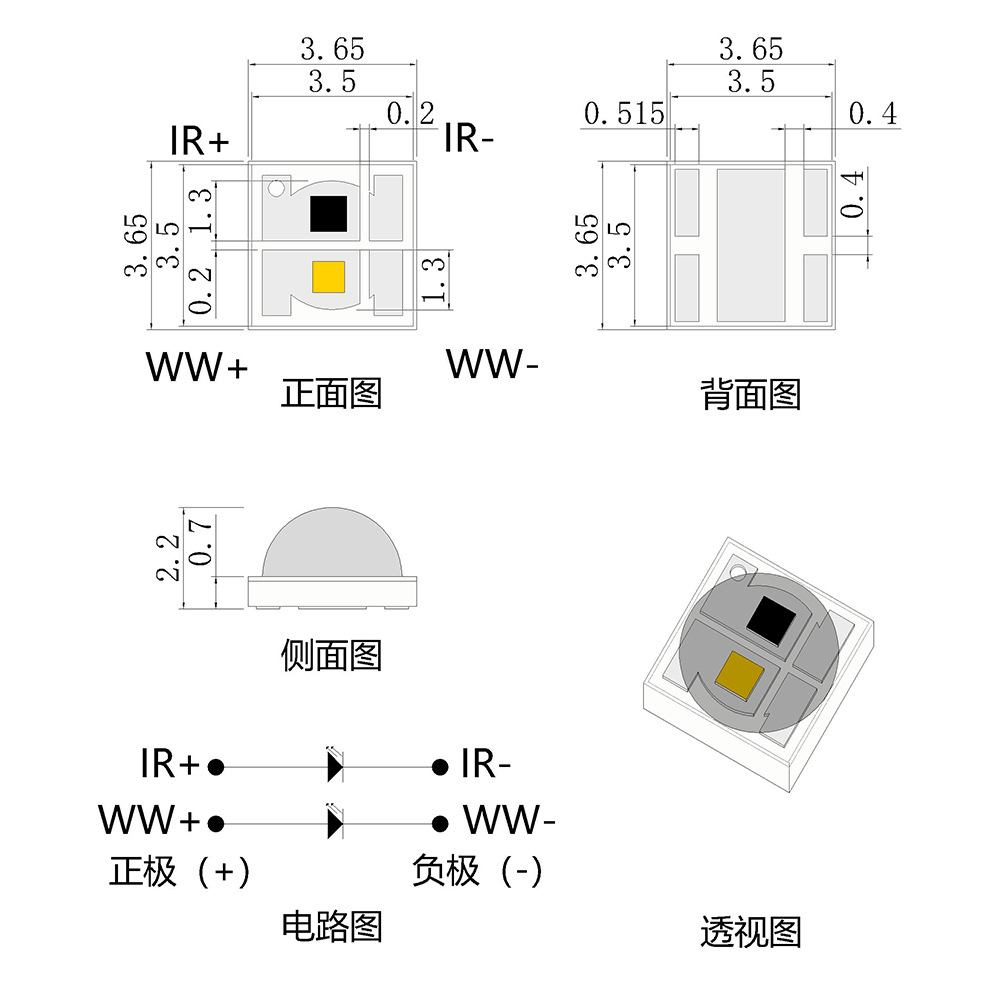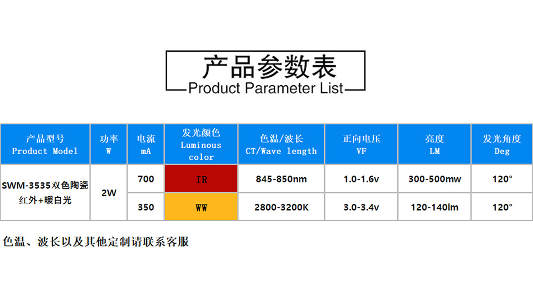 產(chǎn)品名稱:3535紅外850nm+暖白光雙色陶瓷燈珠2W指靜脈識別光源四維明光電