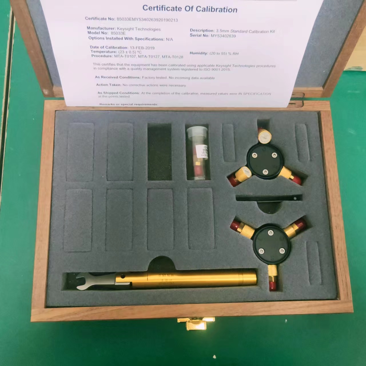 Keysight 85033E 校準(zhǔn)套件包含精密的 3.5mm 標(biāo)準(zhǔn)件,用于校準(zhǔn)是德網(wǎng)絡(luò)分析儀。 標(biāo)準(zhǔn)件包括固定終端、開路和短路(有陰陽面)。 扭矩扳手也包括在標(biāo)準(zhǔn)件中,用于實(shí)現(xiàn)正確連接。 本套件指定的頻率范圍為直流至 9 GHz。