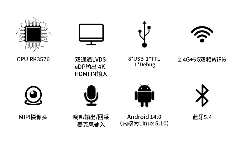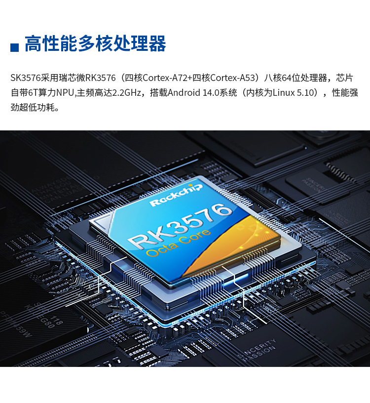 SK3576 采用瑞芯微的 RK3576 高性能八核 ARM64 位處理器,頻率高達(dá) 2.2GHz,芯片自帶 6TOPS 算力 NPU,搭載 Android14.0 系統(tǒng)(內(nèi)核為