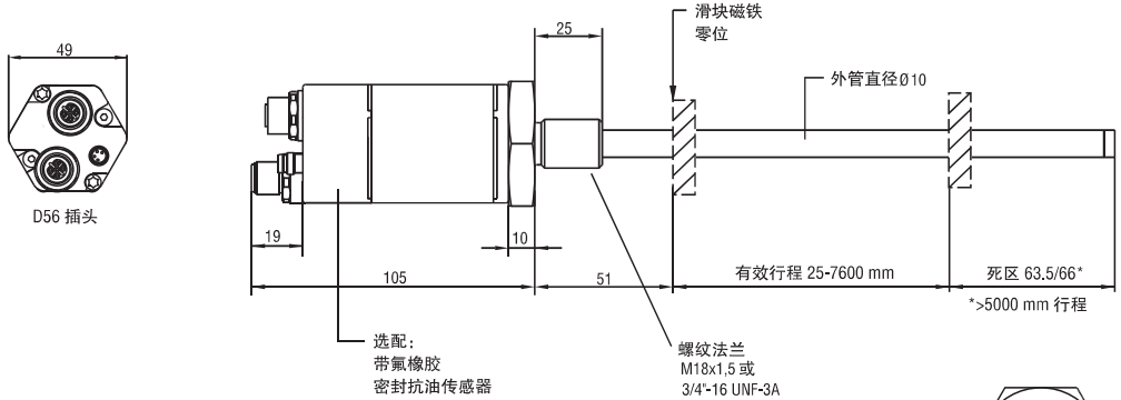 RH 耐壓外管 | 傳感器頭:鋁 傳感桿和法蘭:304 L 不銹鋼 外管壓力:350 bar / 690 bar (峰值) 位置磁鐵:環(huán)形磁鐵,浮動磁鐵或浮球 |