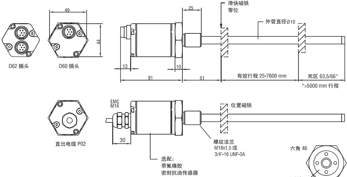 RH 耐壓外管 | 傳感器頭:鋁 傳感桿和法蘭:304 L 不銹鋼 外管壓力:350 bar / 690 bar (峰值) 位置磁鐵:環(huán)形磁鐵,浮動磁鐵或浮球 |