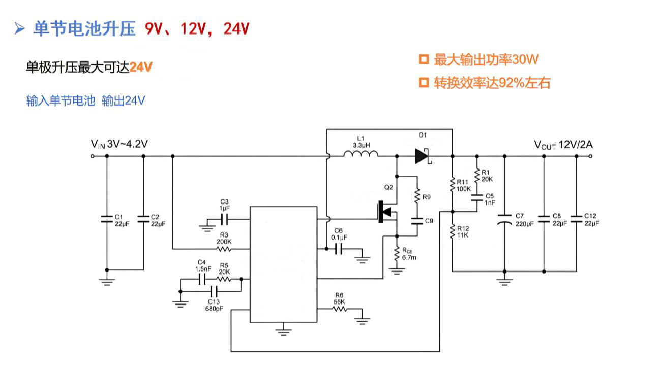惠海小煒 在戶外監(jiān)控、太陽(yáng)能燈具等由單節(jié)電池供電的應(yīng)用中,常需將3.2V至4.2V的電池電壓升壓至30V或48V,以為后端電路提供高壓電源。然而,傳統(tǒng)單級(jí)升壓轉(zhuǎn)換器受占空比限制,難以獨(dú)立完成如此高的電壓轉(zhuǎn)換。為此,采用基于惠海半導(dǎo)體H6922控制器的兩級(jí)升壓方案,成為一種高效而可靠的解決路徑。