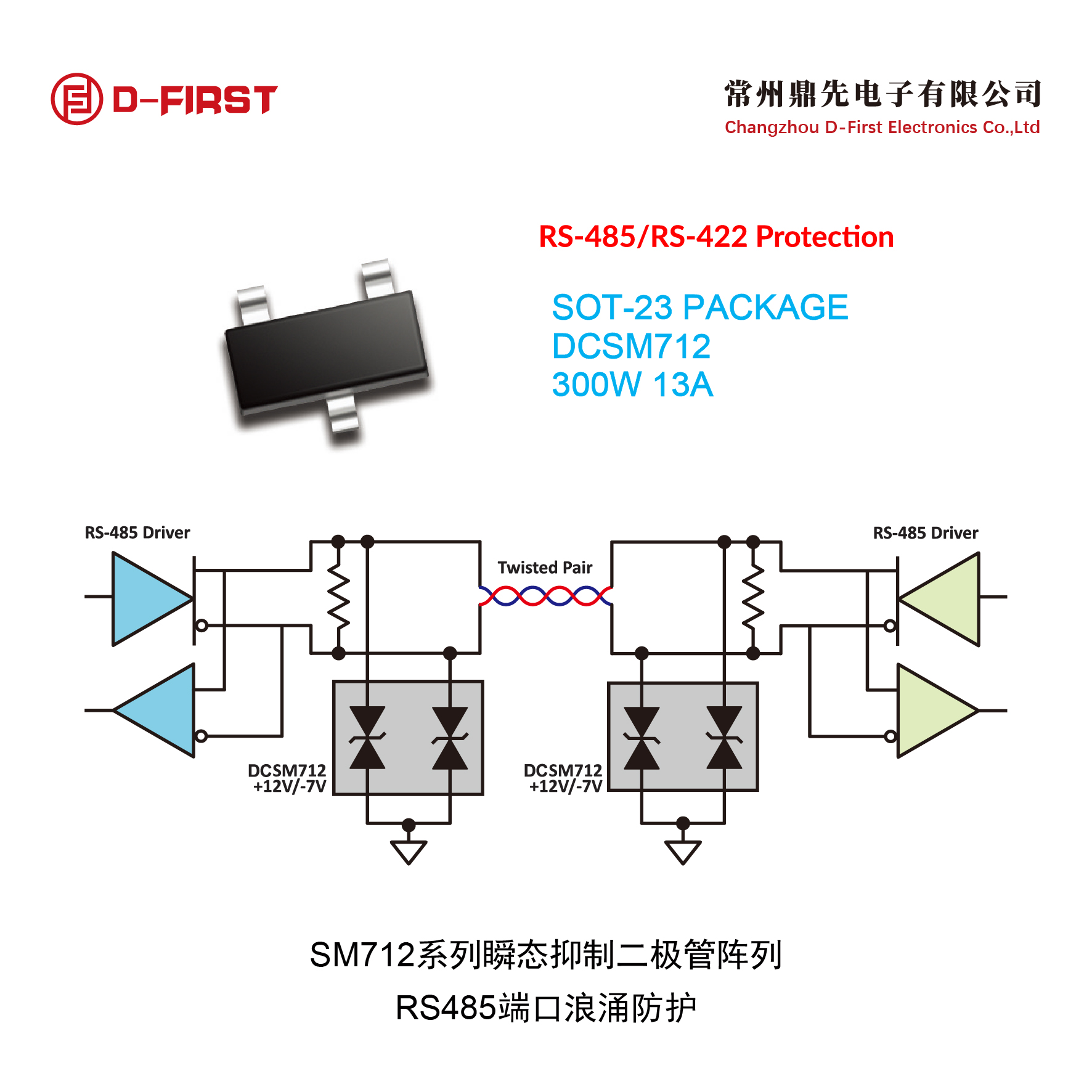 SM712系列雙向不對稱靜電抑制器產(chǎn)品,采用標準SOT-23表面貼裝型封裝,產(chǎn)品具有漏電流小,反應速度快(nS級),可靠性高等特性,被廣泛應用于RS485接口ESD靜電及浪涌防護。