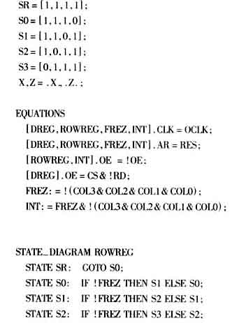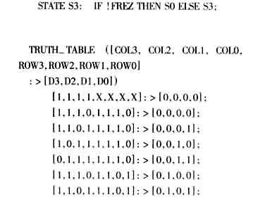 狀態(tài)鏈;去抖延時(shí)結(jié)束后(S5),若按鍵沒有按下則恢復(fù)掃描狀態(tài)鏈(S0);若按鍵確認(rèn)被按下則進(jìn)入保持期(S6),并輸出按鍵編碼?維持至按鍵松開。根據(jù)狀態(tài)圖3和上述的狀態(tài)轉(zhuǎn)移描述,進(jìn)行鍵盤掃描控制電路