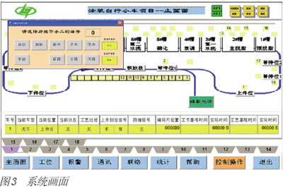 (2)主控柜安裝了一臺HMI,選用菲尼克斯電氣TP 12T觸摸屏,對18臺小車進(jìn)行啟動、停止、吊具的升降及各工序工藝時間的控制和操作;實時顯示整線運(yùn)行情況,在線顯示車組狀態(tài)、位置、所載工件類別和當(dāng)前工藝節(jié)拍狀態(tài)等信息,并能進(jìn)行故障診斷和報警(見圖3)。