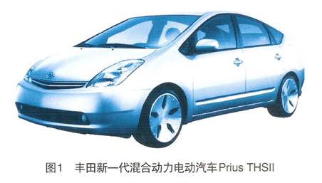 以作為混合動力電動汽車研發(fā)前沿的豐田汽車公司為例,所開發(fā)的混合動力電動汽車已達到實用化水平,自1997年所推出的世界上第一款批量生產(chǎn)的混合動力電動汽車Prius開始,其后又在2002年推出了混合動力面包車,該車混合動力系統(tǒng)采用了世紀首次批量生產(chǎn)的電動四輪驅(qū)動及四輪驅(qū)動力/制動力綜合控制系統(tǒng)。2003年,豐田又推出了新一代Prius,也被稱為“新時代豐田混合動力系統(tǒng)——THS Ⅱ”(見圖1),節(jié)能效果可達到100km油耗不足3L。從2004年開始,豐田公司向歐洲市場推出了一款新的Lexus RX型豪華混合動力轎車。豐田公司計劃2012年全部采用汽油電力混合發(fā)動機,以提高燃油經(jīng)濟性和降低排放污染。