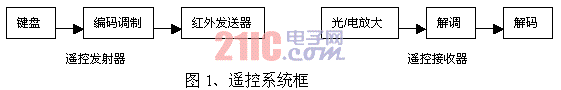 紅外遙控系統(tǒng)的組成紅外遙控系統(tǒng)主要由遙控發(fā)射器、一體化接收頭、單片機(jī)、接口電路組成,如圖一所示。遙控器用來產(chǎn)生遙控編碼脈沖,驅(qū)動紅外發(fā)射管輸出紅外遙控信號,遙控接收頭完成對遙控信號的放大、檢波、整形