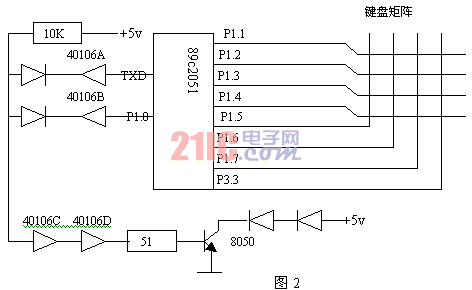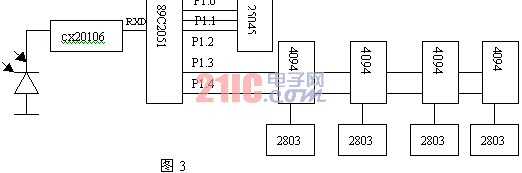 ,僅占用一根接口線,在系統(tǒng)的面板上只需一個小的接收窗。整個接口由發(fā)射和接收兩部分組成。對于單片工業(yè)控制微機(jī)系統(tǒng)所需的按鍵數(shù)目少于30 時,發(fā)射部分可以直接使用成品紅外遙控發(fā)射器,如果自行設(shè)計發(fā)射部分