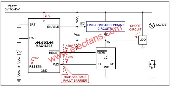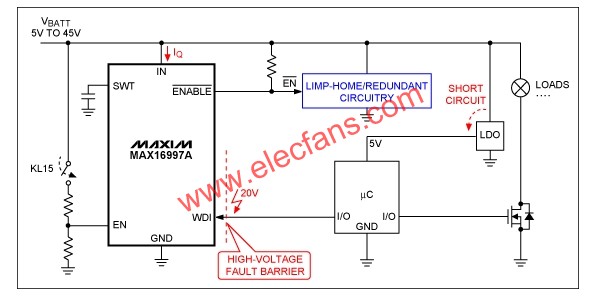 鑒于上述考慮,本max16997 / max16998是理想的提高汽車應(yīng)用系統(tǒng)安全。這些高電壓看門狗定時(shí)器的目的是提供極端的安全性和安全性關(guān)鍵的微處理器控制應(yīng)用程序的安全性。在一個(gè)C發(fā)生故障時(shí),看門狗激活的設(shè)備可以安全地切換到冗余電路(圖1和圖2)。