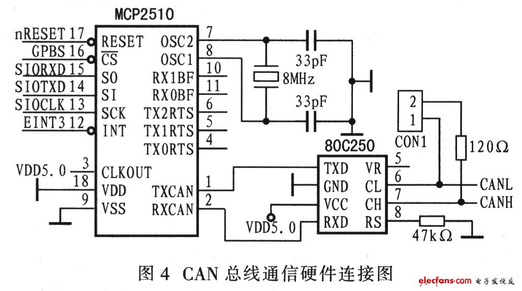 ????? S3C44BOX無SPI接口,但有SIO接口,SIO模塊的發(fā)送和接收既可在上升沿鎖存數(shù)據(jù)位,也可在下降沿鎖存數(shù)據(jù)位,因此可通過設(shè)置S3C44BOX的SIO模塊所對應(yīng)的寄存器實現(xiàn)上升沿發(fā)送數(shù)據(jù),下降沿接收數(shù)據(jù),從而與MCP2510的SPI總線時序相配合。CAN總線通信電路如圖4所示。