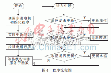 因?yàn)橛臀槐?、發(fā)動(dòng)機(jī)轉(zhuǎn)速表和水溫表的數(shù)據(jù)都是從CAN總線傳過來的,所以將這三塊表的程序整理到同一個(gè)模塊中,轉(zhuǎn)速表和水溫表的函數(shù)功能與油位表相同。程序流程圖如圖4所示。