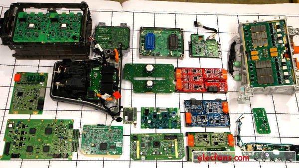 圖1:雪佛蘭Volt電池管理系統(tǒng)將所有功能劃分為用多塊PCB實(shí)現(xiàn)的多個子系統(tǒng)。這次拆解的重點(diǎn)是電池接口控制模塊——上圖從右數(shù)第2欄中的紅色、藍(lán)色和綠色電路板。(UBM TechInsights提供)