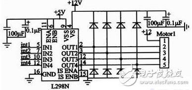 芯片L298N有兩路電源,分別為工作電源和驅(qū)動(dòng)電源。VSS是工作電源,電壓范圍為4.5~36 V,本系統(tǒng)選用5 V工作電壓;VS為驅(qū)動(dòng)電壓,最大為36 V,要求VS最好大于VSS,設(shè)計(jì)中選用12 V.int1、int2、int3、int4為單片機(jī)控制電機(jī)的輸入端,分別對(duì)應(yīng)OUT1、OUT2、OUT3、OUT4四路輸出,輸出接四相五線式步進(jìn)電機(jī)。ISENA、ISENB是使能端,直接接入5 V邏輯電源,也就是說(shuō),兩個(gè)電機(jī)時(shí)刻都保持在使能狀態(tài)。由于我們使用的電機(jī)是線圈式的,從運(yùn)行狀態(tài)突然轉(zhuǎn)換到停止?fàn)顟B(tài)和從順時(shí)針狀態(tài)突然轉(zhuǎn)換到逆時(shí)針狀態(tài)時(shí),會(huì)形成很大的反向電流,在電路中加入二極管的作用,就是在產(chǎn)生反向電流的時(shí)候進(jìn)行泄流,保護(hù)芯片的安全。Motorl為步進(jìn)電機(jī)提供插口。