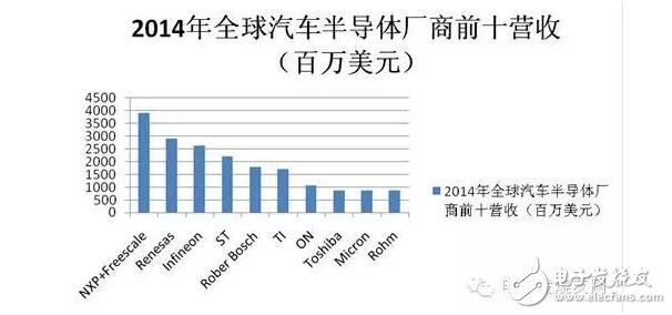 圖2 2014年全球汽車半導(dǎo)體廠商前十大營(yíng)收(百萬美元)