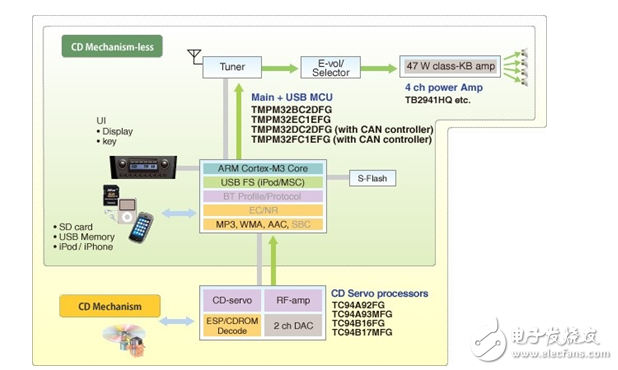 在基于TMPM32BC2DFG的USB汽車影音解決方案的基礎(chǔ)上,加入Toshiba的CD伺服處理器便可以將系統(tǒng)輕松升級到USB+CD音響系統(tǒng)。東芝的CD伺服處理器還具備防震能力。
