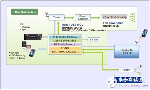 圖示5-大聯(lián)大詮鼎代理的Toshiba適用于汽車電子之汽車影音(藍(lán)牙+USB+CD)解決方案框架圖