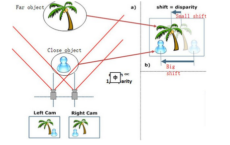 雙目的原理與人眼相似。人眼能夠感知物體的遠近,是由于兩只眼睛對同一個物體呈現(xiàn)的圖像存在差異,或稱“視差”。目標距離越遠,視差越?。环粗?,視差越大。視差的大小對應(yīng)著目標物體的遠近。這也是3D電影能夠使人有立體層次感知的原因。所以說雙目系統(tǒng)對目標物體距離感知是一種絕對的測量,而非估算。