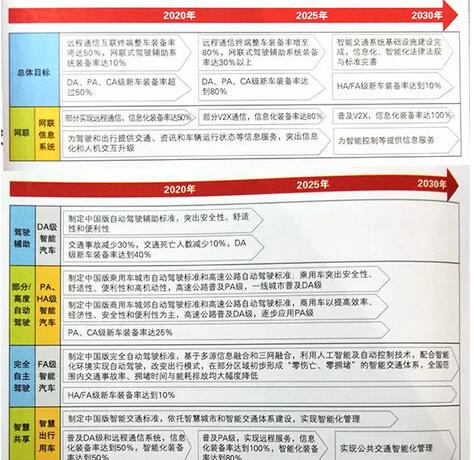 基于自主環(huán)境感知的單項(xiàng)駕駛輔助功能(DA),大規(guī)模運(yùn)用將于2016年實(shí)現(xiàn),以自主環(huán)境感知為主,網(wǎng)聯(lián)信息服務(wù)為輔的部分自動(dòng)駕駛(PA)應(yīng)用將于2018年實(shí)現(xiàn),融合自車(chē)傳感器和網(wǎng)聯(lián)信息,可在復(fù)雜工況下的半自動(dòng)駕駛(CA)將于2020年實(shí)現(xiàn),在2025年以后可實(shí)現(xiàn)V2X協(xié)同控制,完成高度/完全自動(dòng)駕駛功能(HA/FA),在2030年左右實(shí)現(xiàn)一定規(guī)模的產(chǎn)業(yè)化應(yīng)用。