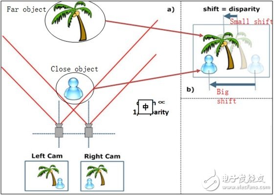 雙目攝像頭的原理與人眼相似。人眼能夠感知物體的遠近,是由于兩只眼睛對同一個物體呈現的圖像存在差異,也稱“視差”。物體距離越遠,視差越?。环粗?,視差越大。視差的大小對應著物體與眼睛之間距離的遠近,這也是3D電影能夠使人有立體層次感知的原因。