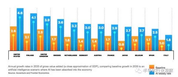 當視覺處理開始涉及到AI時,便受到了極大的關(guān)注,主要是因為特斯拉在預(yù)計推出自動駕駛汽車的15年前就已經(jīng)提出了自動駕駛概念。這為視覺處理技術(shù),以及為處理由圖像傳感器、雷達和激光雷達收集的數(shù)據(jù)所需的芯片和整體系統(tǒng)架構(gòu)開辟了巨大的市場。但許多經(jīng)濟學(xué)家和咨詢公司正尋求超越這個市場,探討AI將如何影響整體生產(chǎn)力。Accenture最近的報道預(yù)測,AI將使一些國家的GDP翻番(見下圖2)。雖然這將導(dǎo)致就業(yè)機會大幅減少,但整體收入的提高不容忽視。